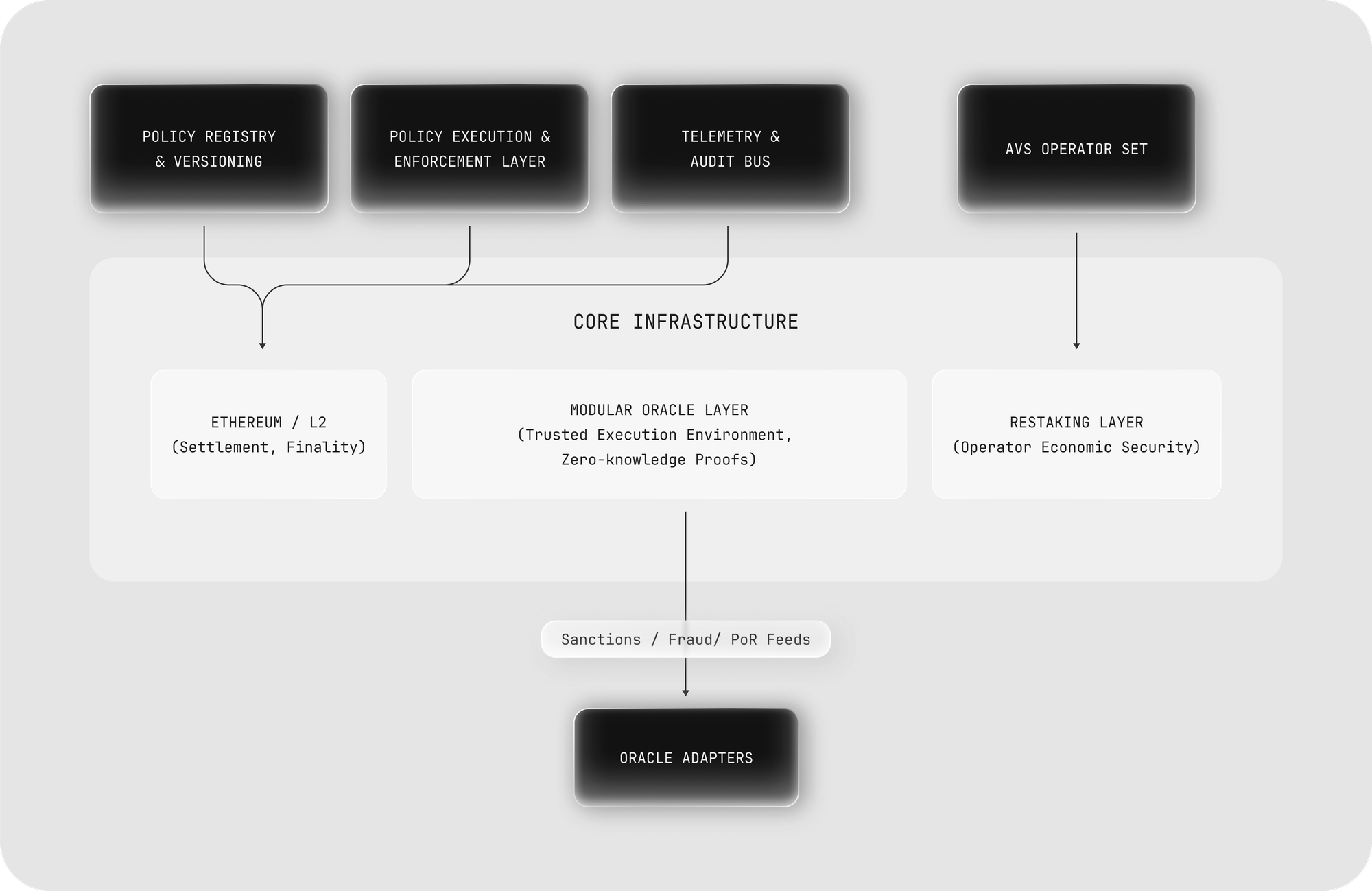 A decentralized network of operators, secured by Ethereum restaking, evaluates transactions against Policies. Operators are economically bonded and subject to slashing for dishonest behavior. Their attestations serve as proof that a transaction has satisfied all relevant rules.