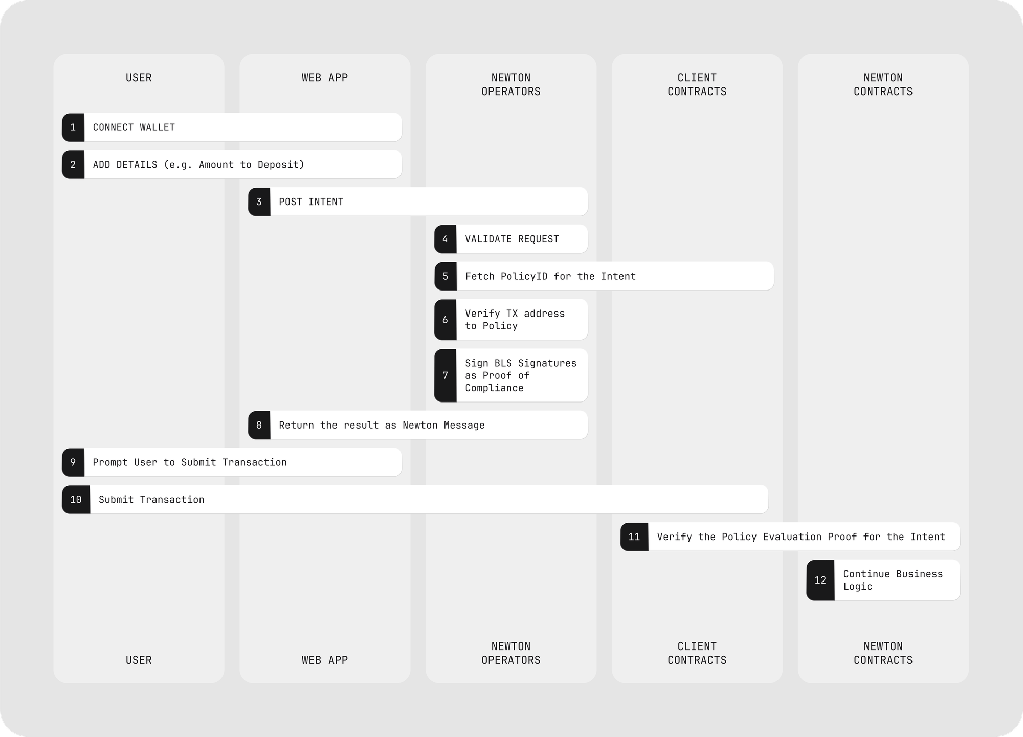 - Submit Transaction: The application submits a request to the Newton AVS Task Manager containing the transaction intent