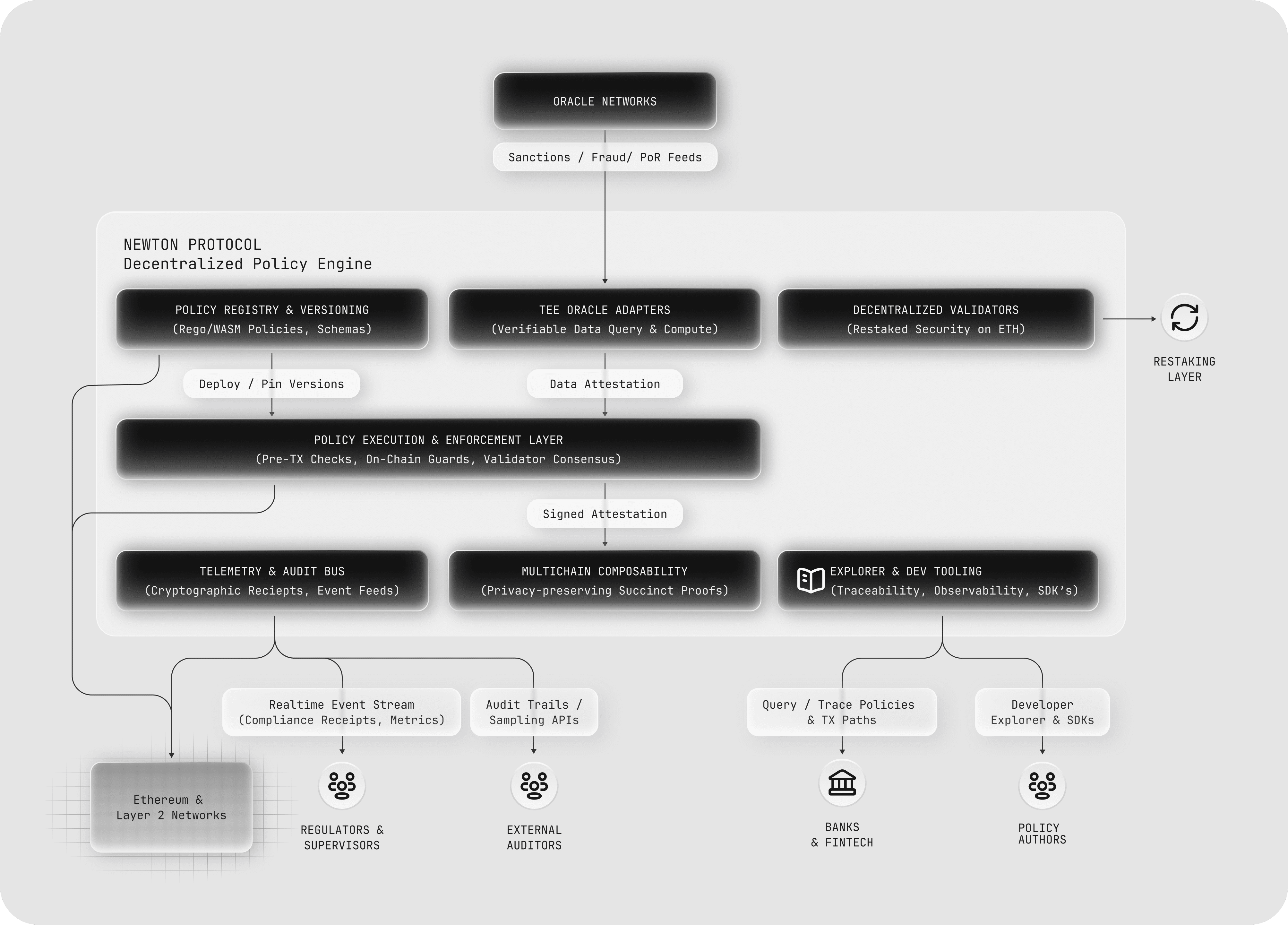 - Oracle Adapter Layer: TEE-based real-time oracle layer to various onchain or offchain data sources for policy evaluations with verifiable proofs enabling Newton Policies to incorporate both onchain and offchain in a privacy-preserving but verifiable manner.